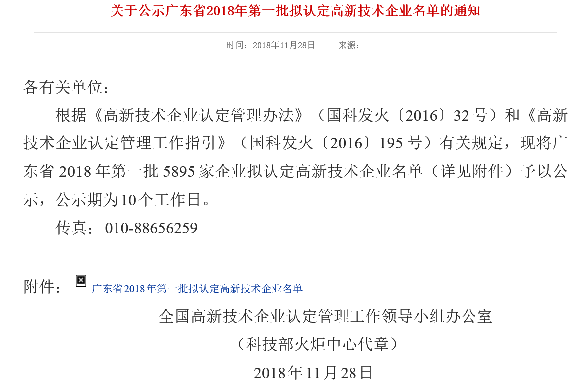 2018年11月28日,根据“全国高新技术企业认定管理工作领导小组办公室”公示显示,全网汇一集团旗下的广州友为软件科技公司顺利通过“广东省2018年第一批拟认定高新技术企业”,并在政府官网进行了公示。